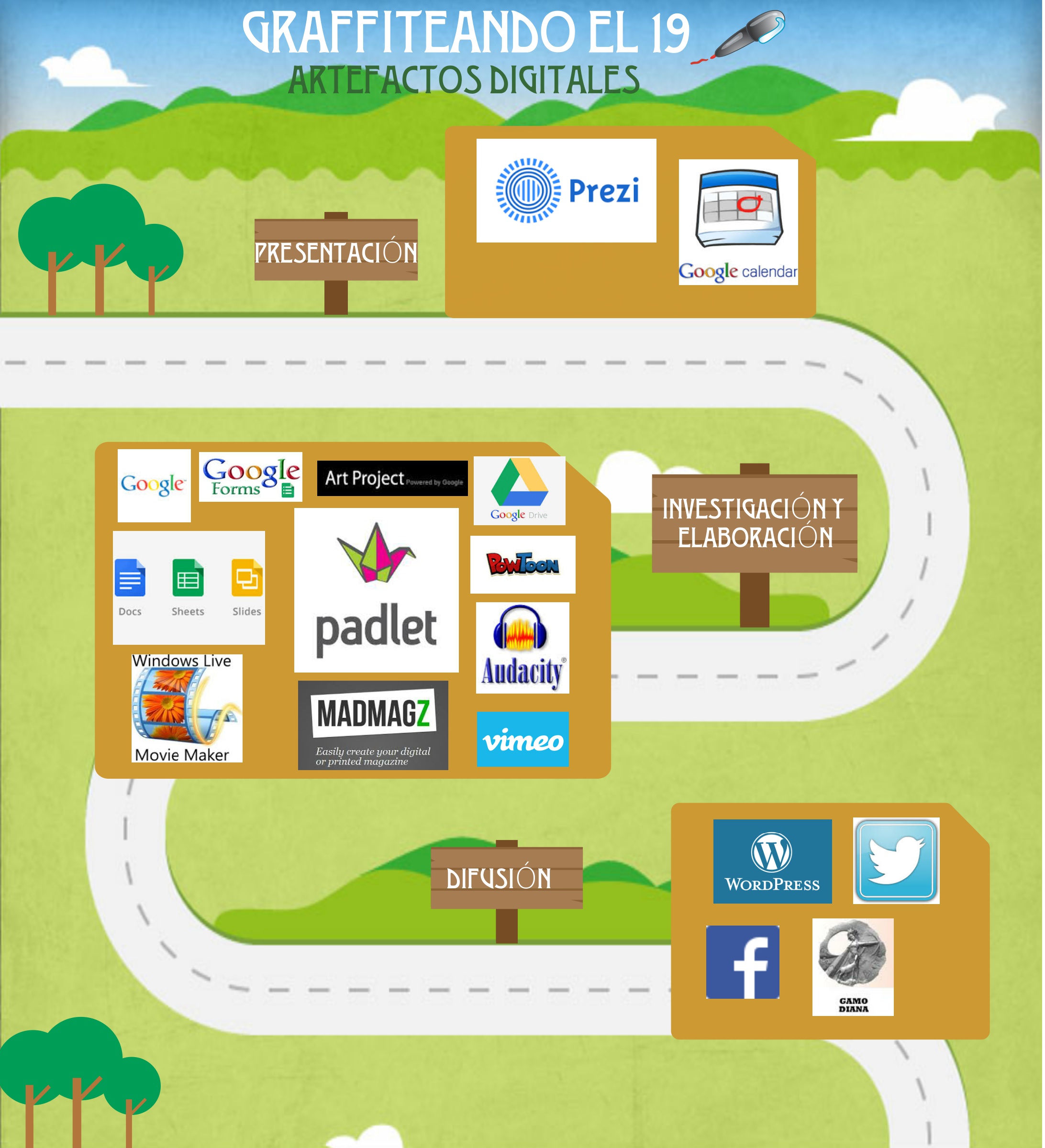A continuación, tenemos que recopilar la información para elaborar nuestro muro virtual. Para ello, elaboraremos un cuestionario en Google Forms, y a partir de las respuestas de la comunidad educativa procederemos con la investigación sobre los autores y obras escogidos (Google, Art Project), que organizaremos en el entorno Google (Drive, Docs, Sheets, Slides). Finalmente, construiremos nuestro muro multimedia en Padlet, incorporando otras herramientas como Powtoon, Madmagz, Audacity, Vimeo, Moviemaker, etc.